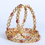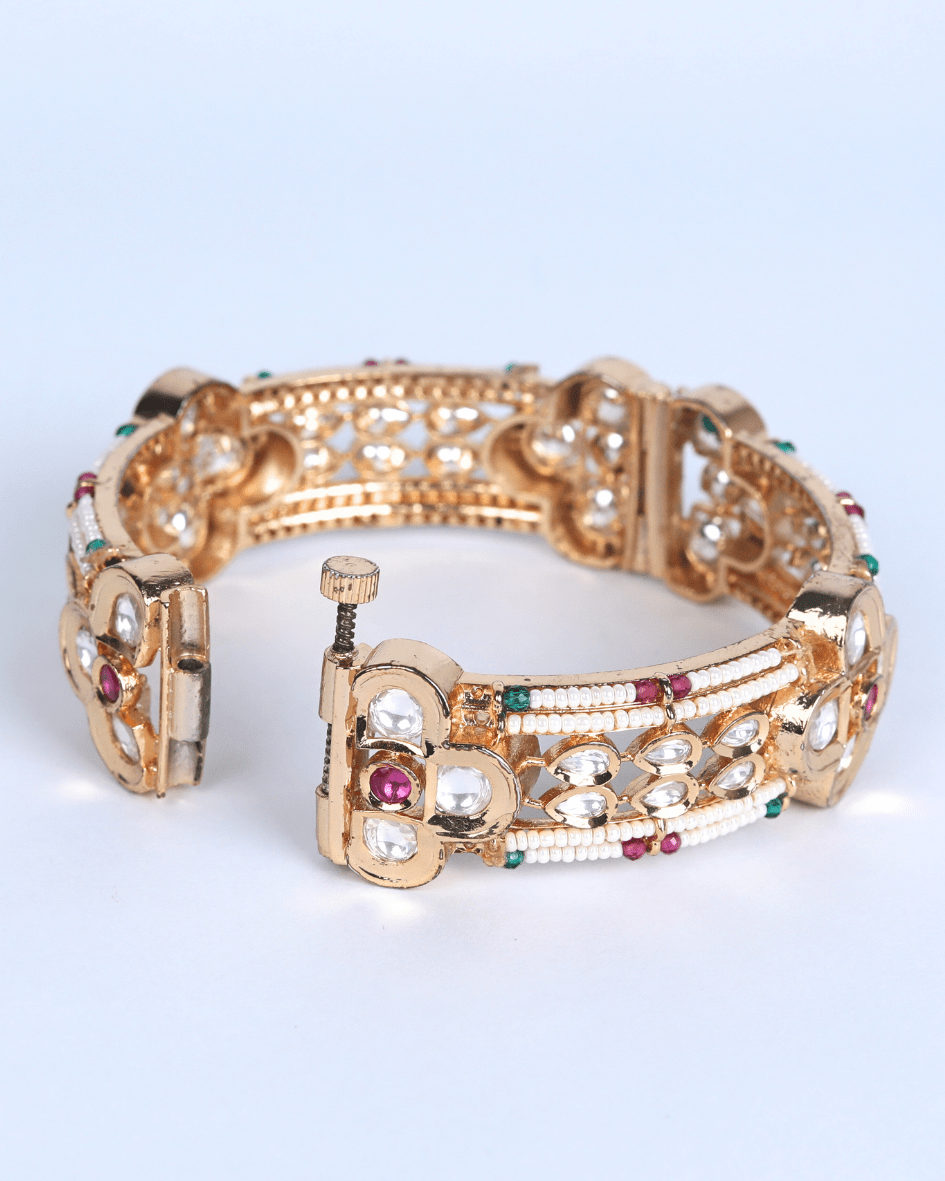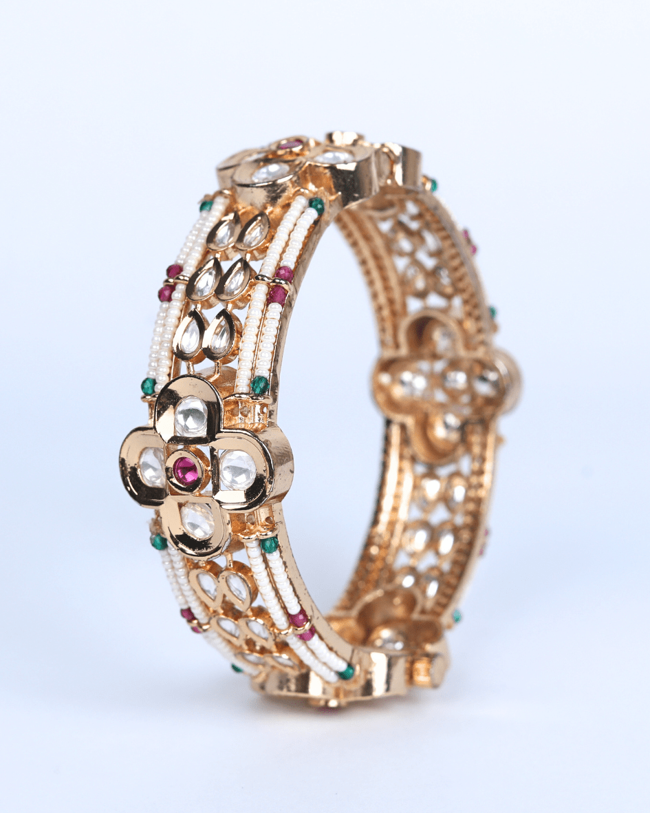 This article potentially identified as Gold Finish Kundan Polki & Gold Plated Kundan with Red Onyx Stone Mixed Flower & Pearls Bangles. It features Kundan Polki stones, red stones, and pearls set in a floral design. The bangle has an intricate, openwork design on the sides and a white enamel or similar material accentuating the floral and gemstone settings.