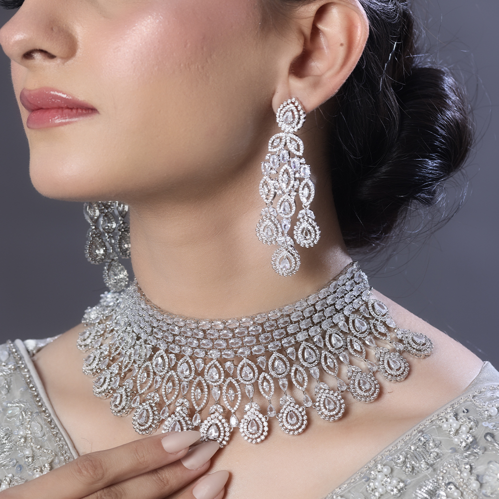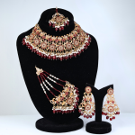 A stunning traditional jewellery set for a wedding or festives to make your occasion memorable. It includes a necklace, a headpiece (mangtika), and a pair of earrings, all featuring intricate gold-toned designs adorned with red and white beads or stones. The necklace is a choker style with a broad, ornate pattern, while the mangtika matches its design and hangs elegantly on the forehead. The earrings are large and teardrop-shaped, complementing the set with their detailed craftsmanship and dangling elements. The overall aesthetic is rich and luxurious, perfect for adding a touch of cultural elegance to any special event.