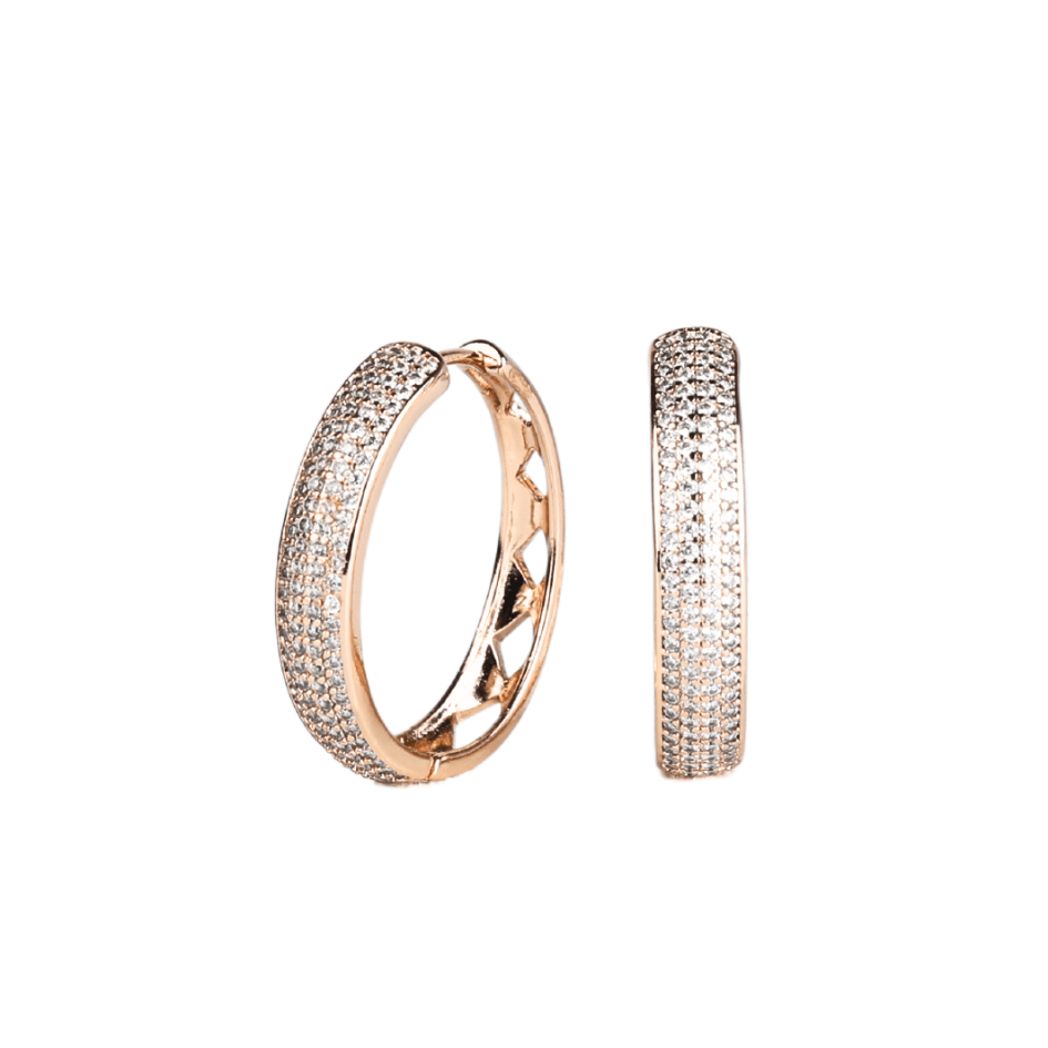 The Kzia Crystal Rose Gold Hoop Earrings are a dazzling statement of elegance. These earrings feature a warm, rose gold finish, encrusted with shimmering crystals that catch the light with every movement. The pave setting ensures maximum sparkle, creating a luxurious and sophisticated look. Their classic hoop design is timeless, making them versatile enough for both everyday wear and special occasions.