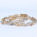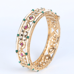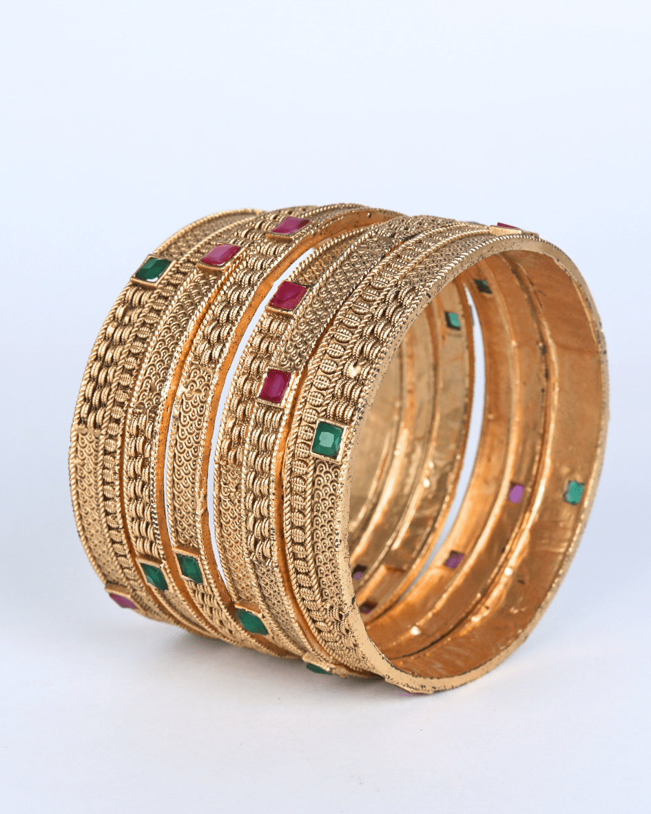 A set of six gold-plated bangles, each adorned with small square-cut red and green stones. The bangles feature a textured, patterned