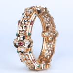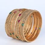 A set of two gold-toned bangles, embellished with clear and peach-colored stones. The bangles feature an intricate, wavy design with alternating sections of sparkling clear stones and larger, rectangular peach stones. The metalwork has a textured finish, adding to the overall visual interest of the jwellery.