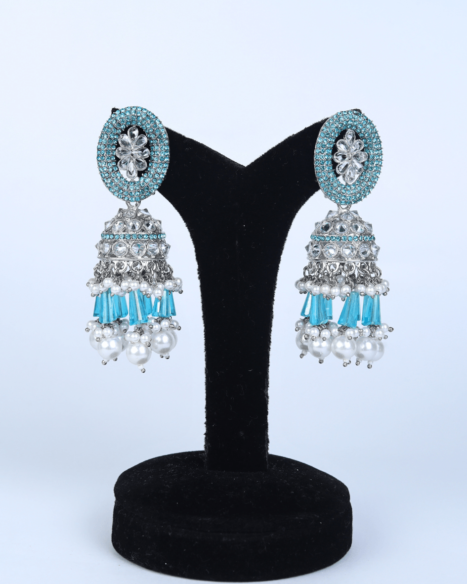 These jhumka earrings feature an intricate design with a blend of traditional and contemporary aesthetics. The ear studs showcase a floral-like clear stone center, encircled by small, shimmering sky-blue stones set in an oval shape. Below the stud, a silver-toned, bell-shaped structure is adorned with delicate filigree work and additional sky-blue accents. Strands of tiny white beads and translucent sky-blue, prism-shaped crystals dangle from the base, culminating in larger, lustrous pearl-like beads that add a touch of elegance and movement. The earrings are perfect for adding a sophisticated sparkle to any ensemble.