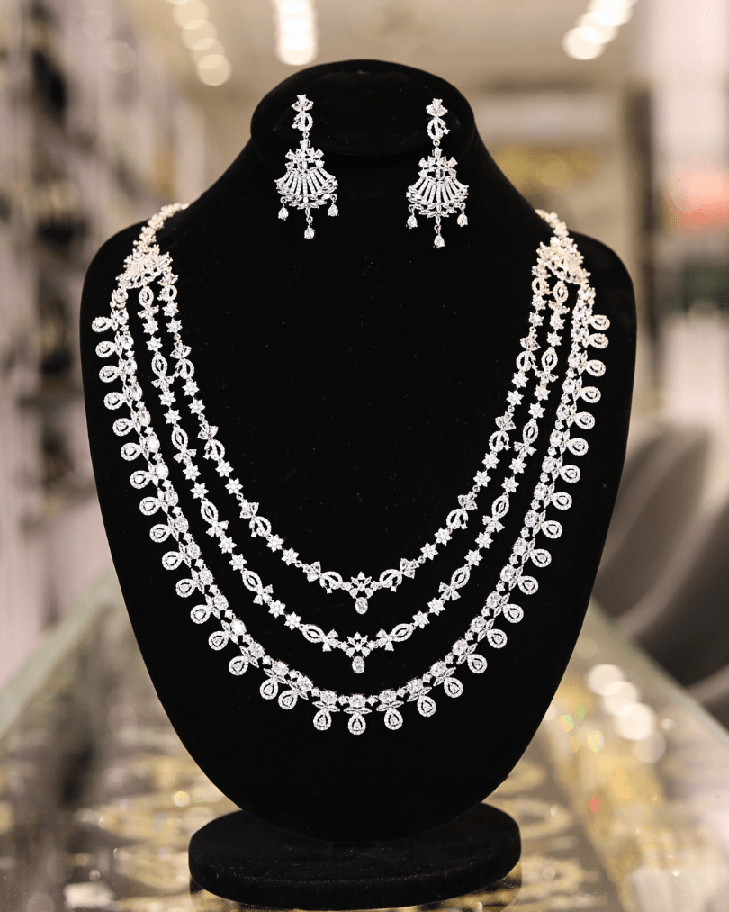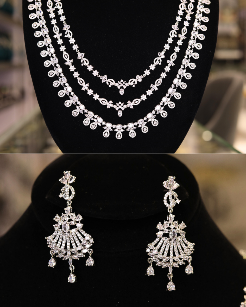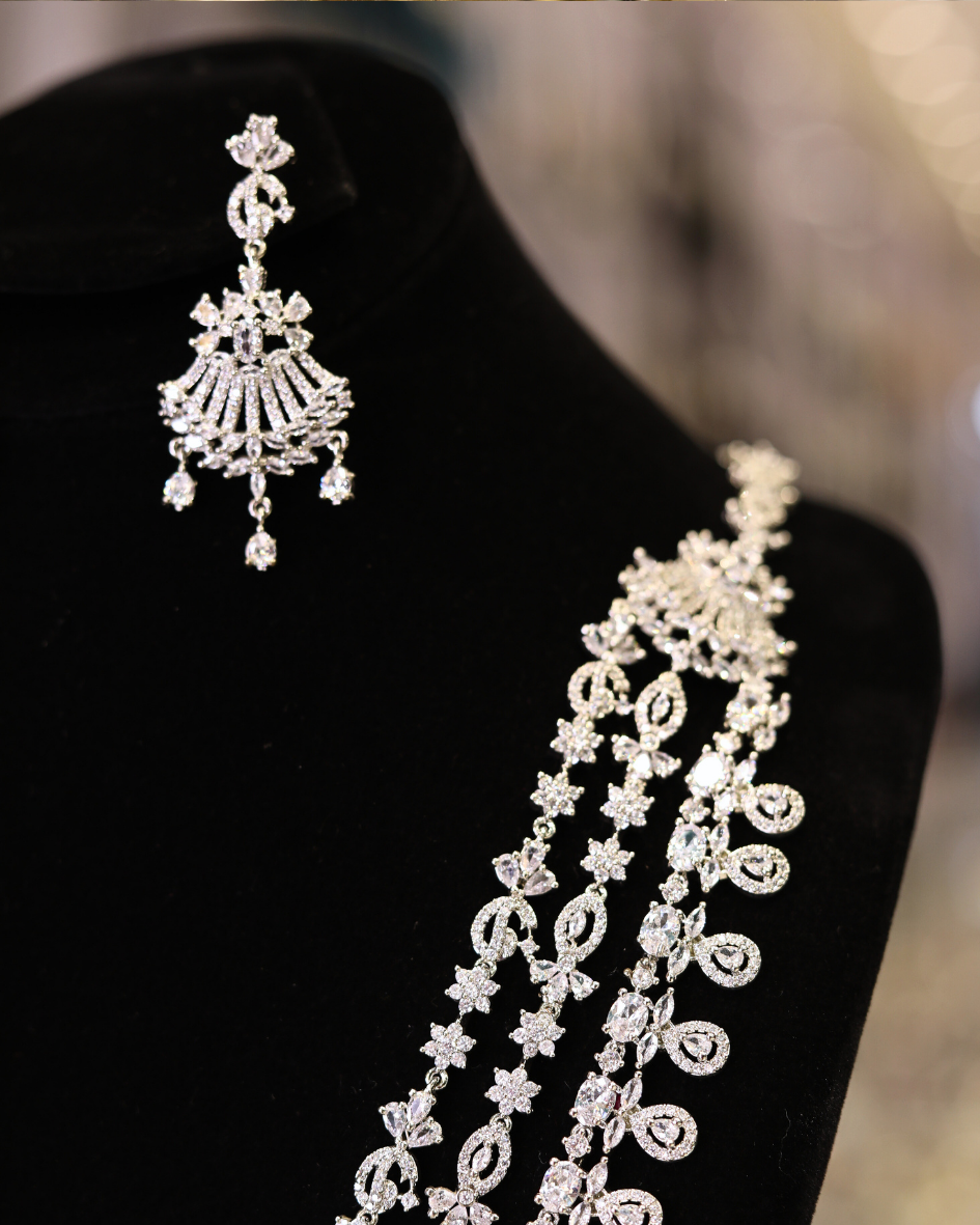 The jewelry set features a cascade of elegance with its layered design and shimmering crystals. It includes a multi-strand necklace and matching earrings, displayed on a black velvet bust that accentuates their brilliance. The necklace comprises four strands, each featuring a unique pattern of intricately set crystals, ranging from floral motifs to teardrop shapes, creating a layered effect that catches the light with every movement. The earrings mirror the design elements of the necklace, featuring a chandelier-style arrangement of crystals that dangle gracefully. The use of clear crystals emphasizes the set’s sparkle and sophistication, making it suitable for formal occasions.