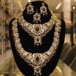 The exquisite jewelry set features a layered necklace and matching earrings, showcasing a blend of traditional elegance and intricate design.