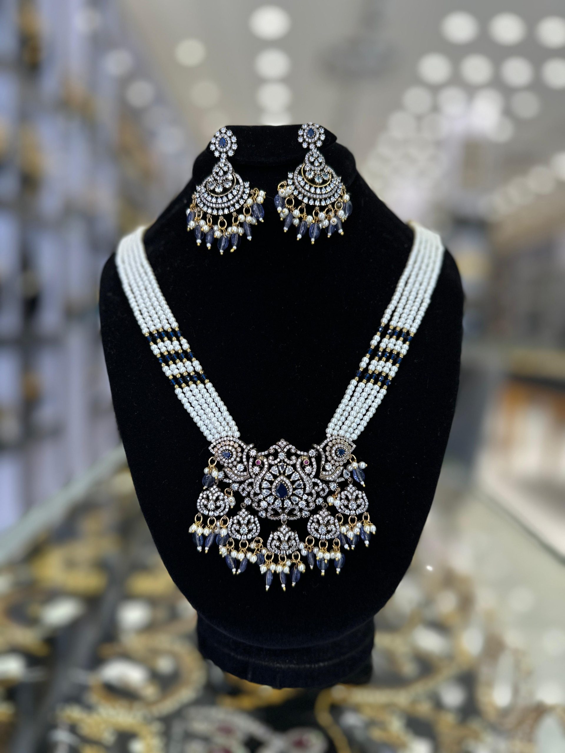 The centerpiece is a multi-layered necklace featuring strands of lustrous white pearls, interspersed with sections of contrasting black and white beads, creating a striking visual rhythm. The focal point is a large, ornate pendant adorned with intricate stonework, likely incorporating Kundan or similar techniques, and embellished with navy blue stones or beads, possibly sapphires or lapis lazuli, dangling gracefully.