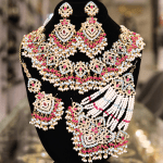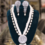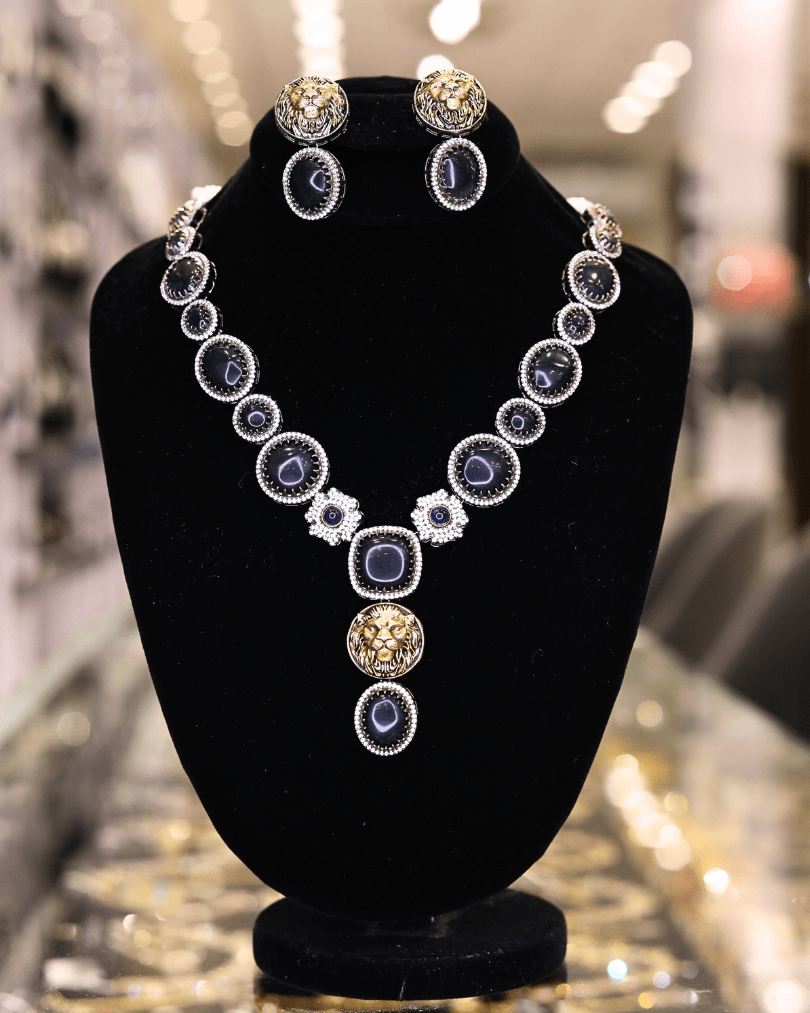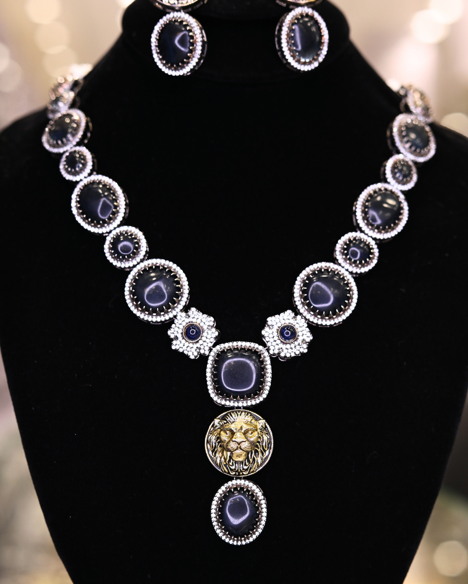 The product is a jewelry set featuring a necklace and a pair of earrings. The set is characterized by its use of dark, black onyx or glass stones, encircled by smaller, clear gemstones that could be diamonds or cubic zirconia. The necklace’s focal point is a series of graduated dark stones, each framed by the clear stones, with decorative elements in between that add a touch of intricacy. The pendant section of the necklace features a larger dark stone, above which is a circular element with a lion’s head design in gold or a gold-toned metal. The earrings mirror the necklace’s design, with a dark stone surrounded by clear stones and topped with a smaller lion’s head design. The metalwork appears to be silver or a similar light-colored metal, providing a striking contrast against the dark stones and the black display. The overall aesthetic of the set is bold and luxurious, suitable for formal occasions or as a statement piece.