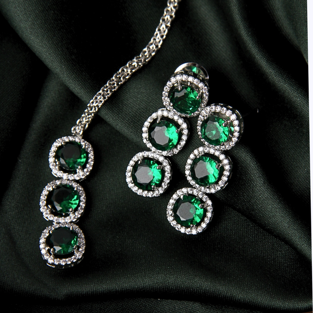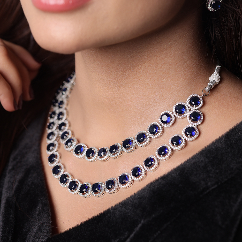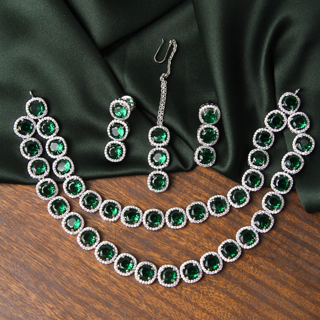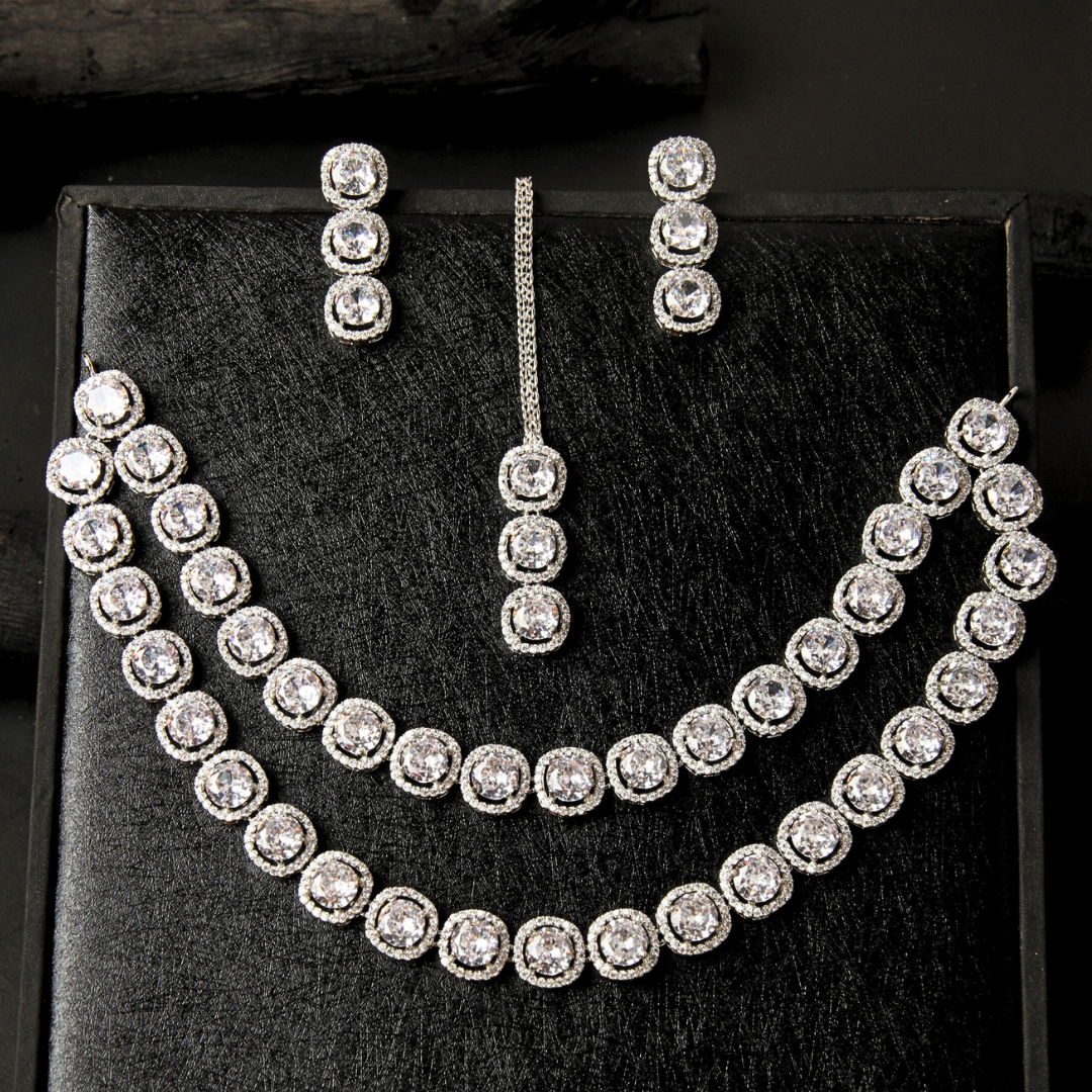 Exude grace with the Zircon Radiance Set, featuring a double-layered necklace and a matching maang tikka. This party wear jewelry set is perfect for wedding ceremonies or gatherings, making you stand out with its luminous charm.